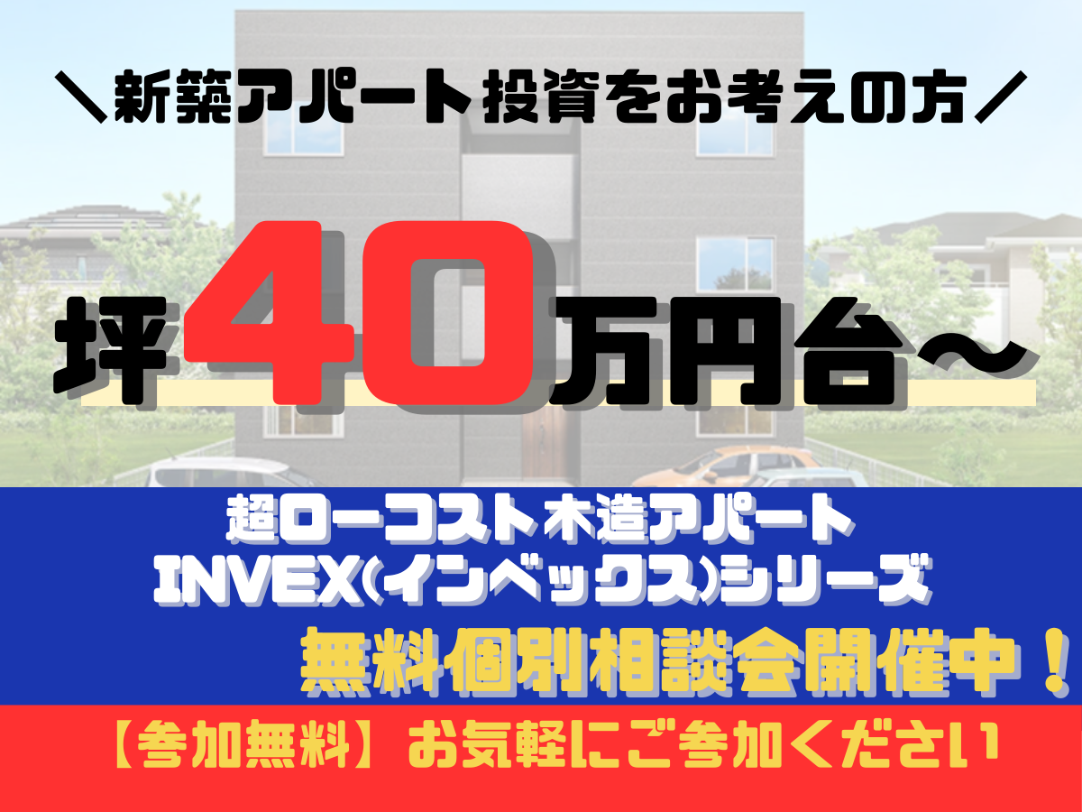 【最適な不動産投資をご提案】超ローコスト木造アパート、INVEXシリーズの無料個別相談会を開催中! 千葉で、投資家デビューしたい方・収益アパートを建築したい方・投資家に収益アパートを紹介したい不動産会社や金融機関の方はお気軽にご連絡ください。